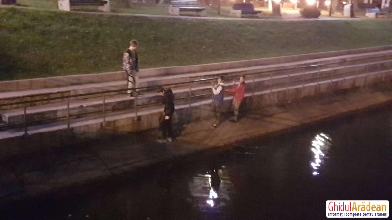 Copii teribilişti erau încurajaţi de pe margine, de către un prieten, să se întreacă până la capătul balustrăzii, semn că aceştia duceau o adevărată competiţie. O arădeancă a imortalizat momentul cu telefonul mobil iar când s-au văzut fotografiaţi, copii au rupt-o efectiv la fugă spre capătul balustrăzii pe panta abrupăt urmând ca mai apoi să repete experienţa şi pe latura lacului dinspre catedrală, pe balustrada aflată la mai bine de 2 metri deasupra apei.
