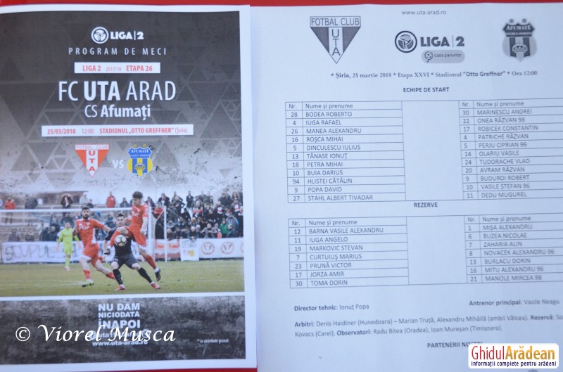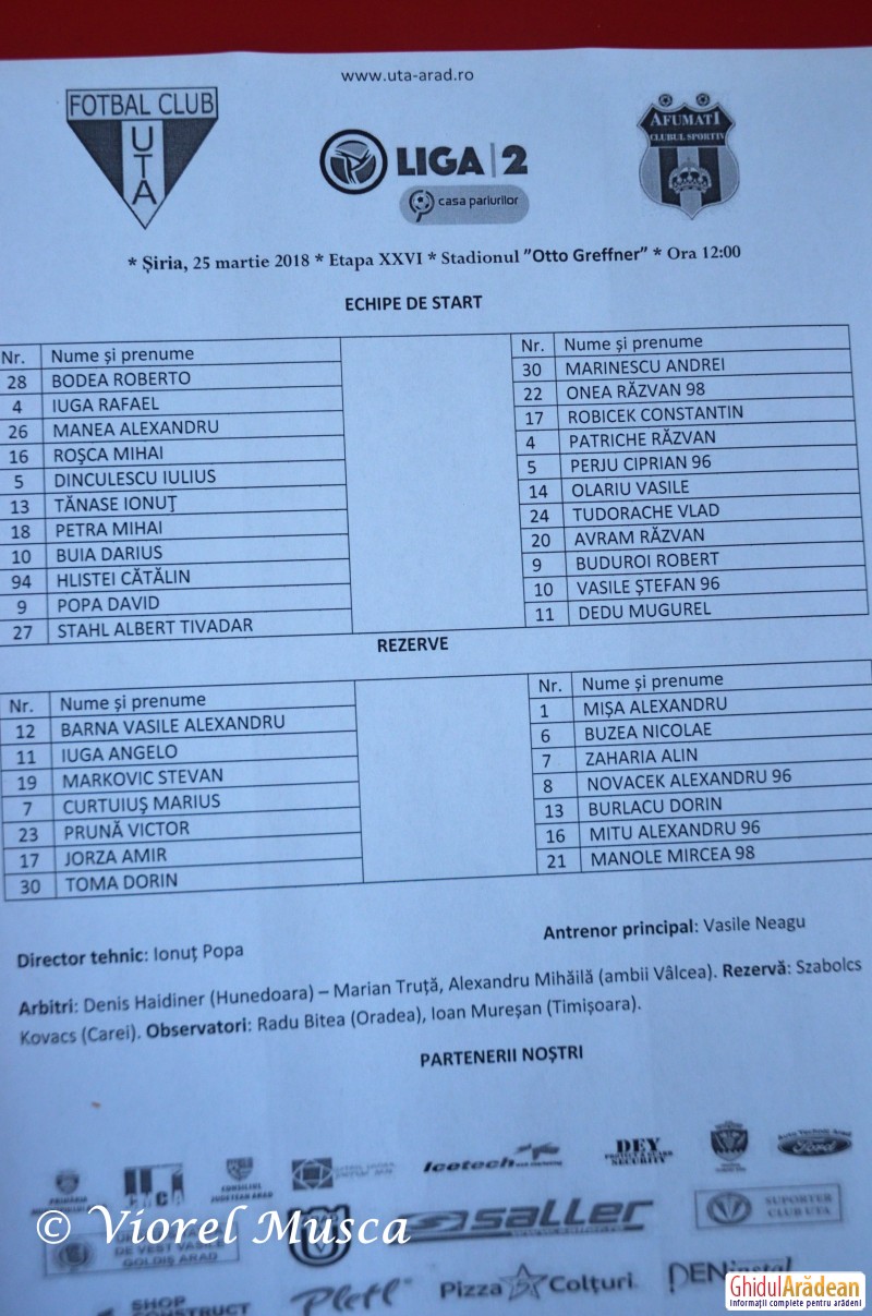 Pentru UTA a jucat : Bodea – R. Iuga, Manea, Roșca, Dinculescu – Stahl, Tănase, Petra, Hlistei – Buia – D. Popa. Rezerve: Barna – R. Iuga, Markovic, Prună, Toma, Jorza, Curtuiuș.