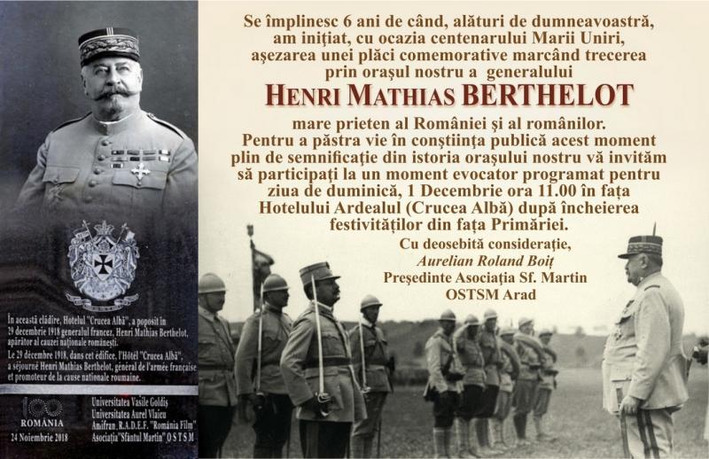 Se împlinesc 6 ani de când, cu ocazia Zilei Naționale a României, Asociația Sfântul Martin filiala Arad a OSTSM România, alături de Universitatea de Vest ,,Vasile Goldiș” Arad, Universitatea Aurel Vlaicu Arad, R.A.D.E.F. ,,România Film” și Amifran au inițiat așezarea unei plăci comemorative marcând trecerea prin orașul nostru a generalului Henri Mathias Berthelot, mare prieten al României și al românilor.